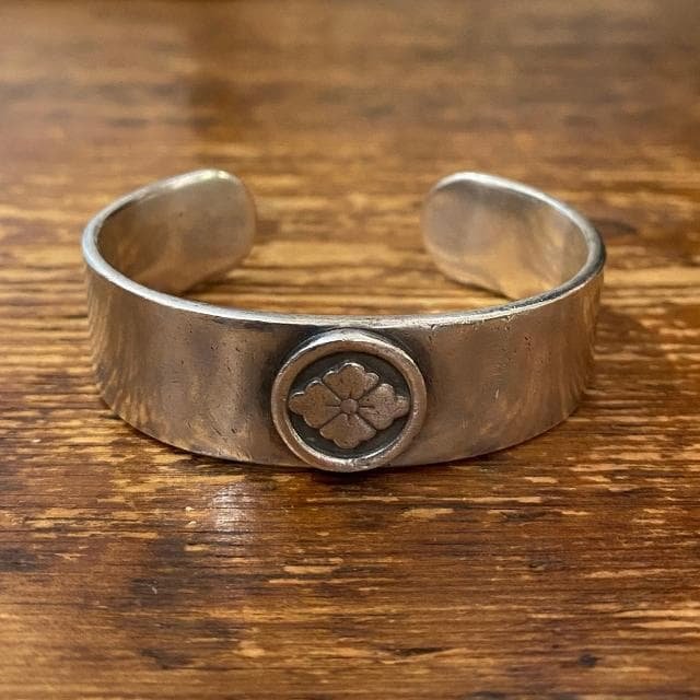 大航海時代にヨーロッパから交易品としてネイティブアメリカンに渡ったトレードシルバーやそれらに影響を受けたであろう平原部族が得意とするデザインにインスピレーションを得て独自の解釈で制作したバングルです。異なる文化のミックスやアレンジを更に再構築しました。シンプルなスタンプワークの組み合わせで模様を描き、構成で土臭さは残しながらもヨーロッパ的な洗練された雰囲気も合わさったバングルです。デザインに合わせて白っぽい仕上げにしています。歴史を踏襲しつつも特定の年代や地域、部族に捉われることなく絶妙なバランスで表現した新しいチャレンジです。元彼の忘れ物です。誰かもらってあげてください。ご覧いただきありがとうございます。